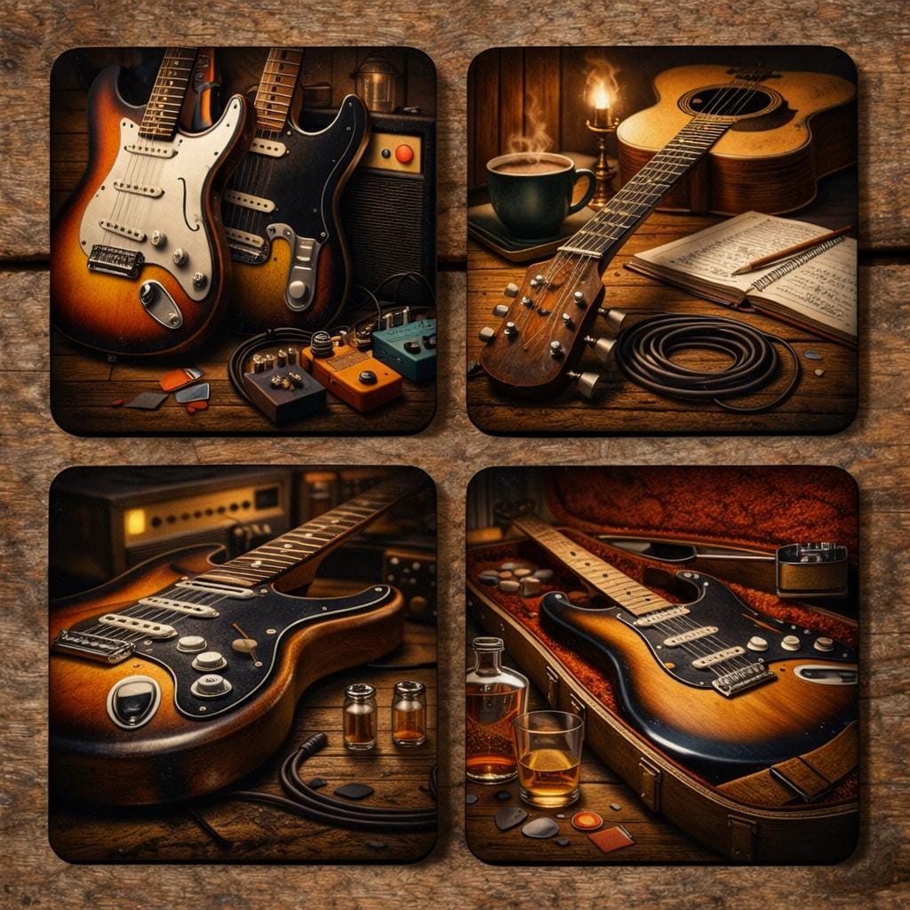 Bring warm vintage character and classic music vibes into your home with this set of four guitar-themed coasters, inspired by timeless electric and acoustic guitars. Each design captures the rich textures of wood, strings, amps, pedals, and cosy studio scenes, creating a moody, nostalgic aesthetic that guitarists and music lovers instantly connect with.