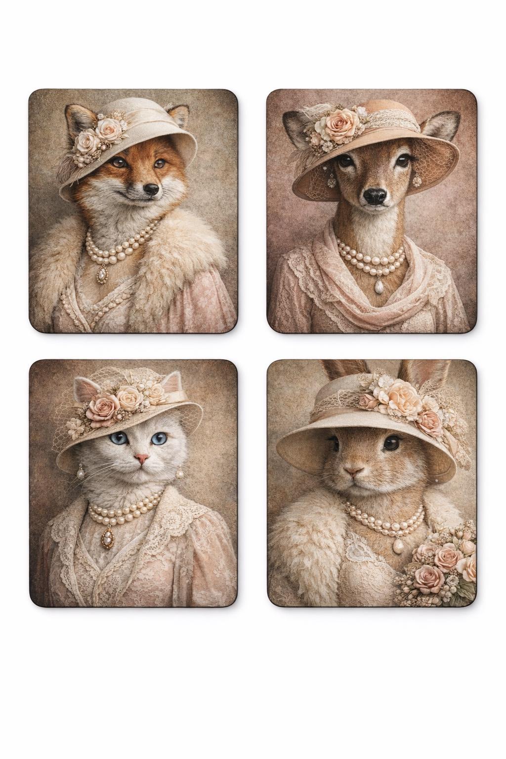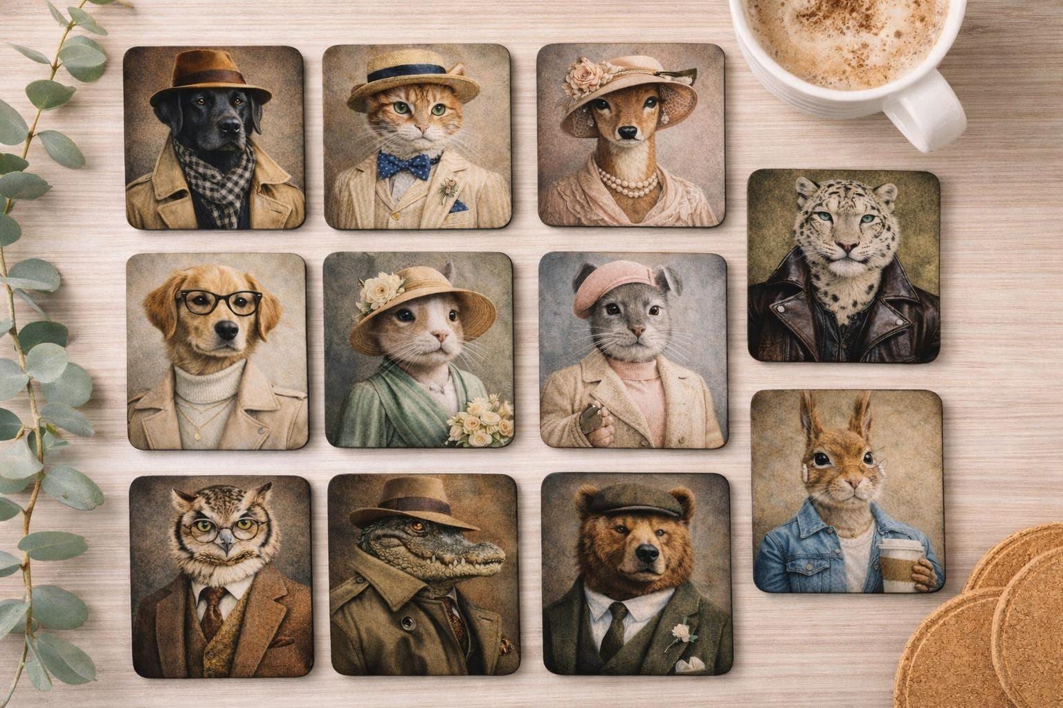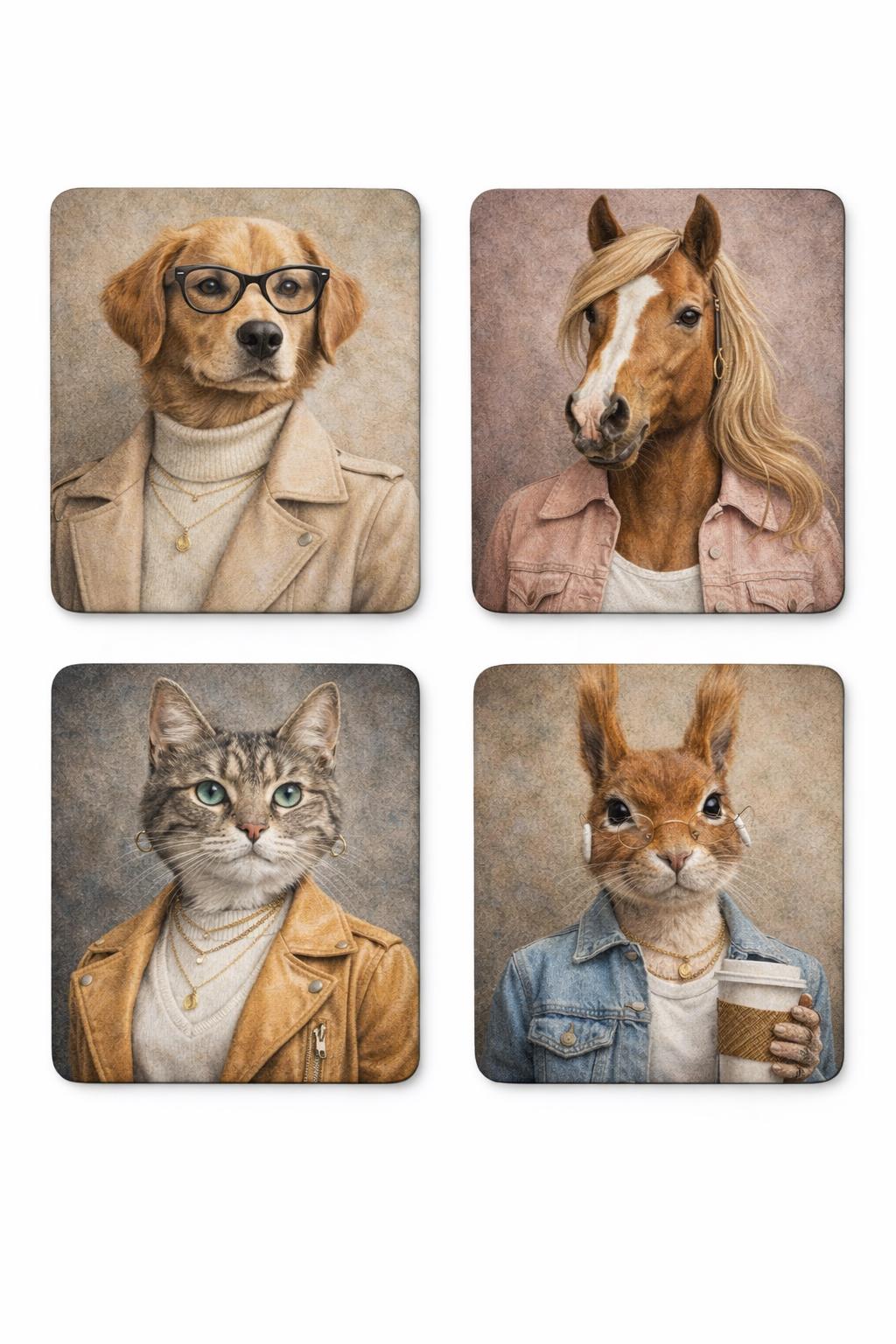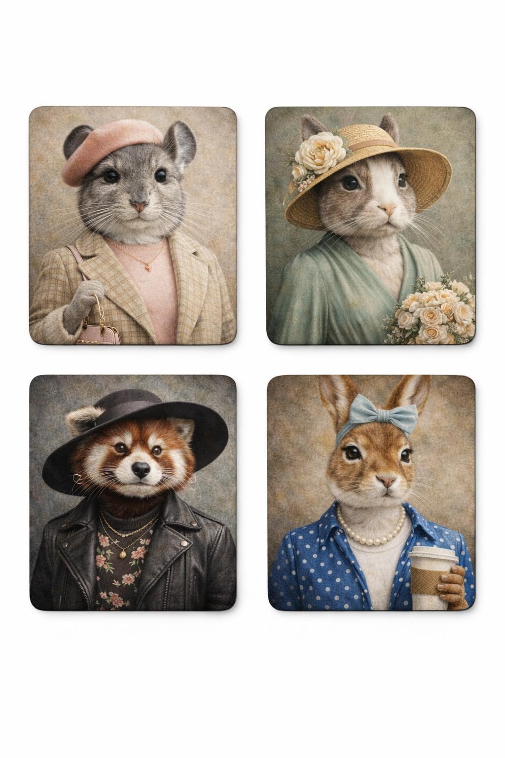 Add character and charm to your home with this unique set of animal portrait coasters, featuring stylishly dressed animals in a mix of modern and vintage outfits. Each coaster showcases a beautifully detailed anthropomorphic animal illustration, designed to feel playful, elegant, and full of personality.