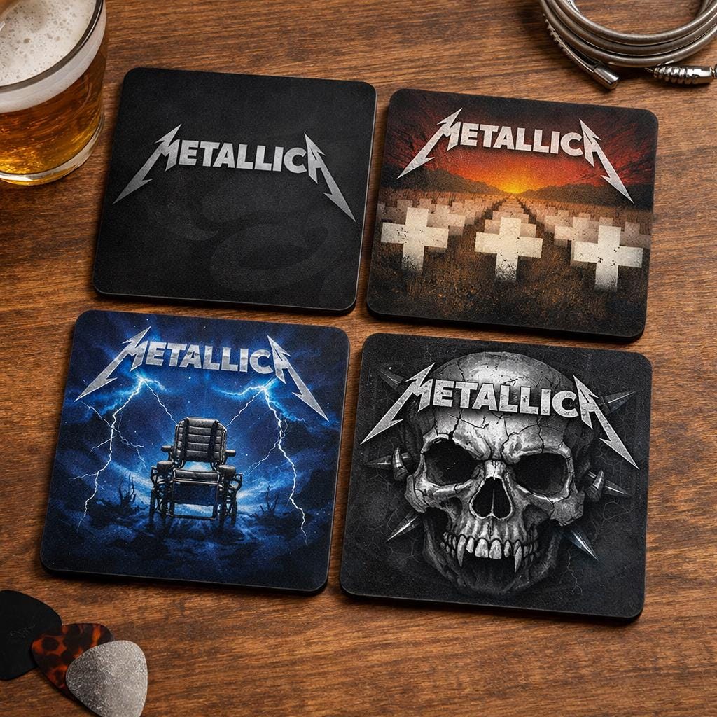 Featuring four powerful designs inspired by classic album artwork, these coasters are perfect for fans of rock music, metal culture, and statement home decor.