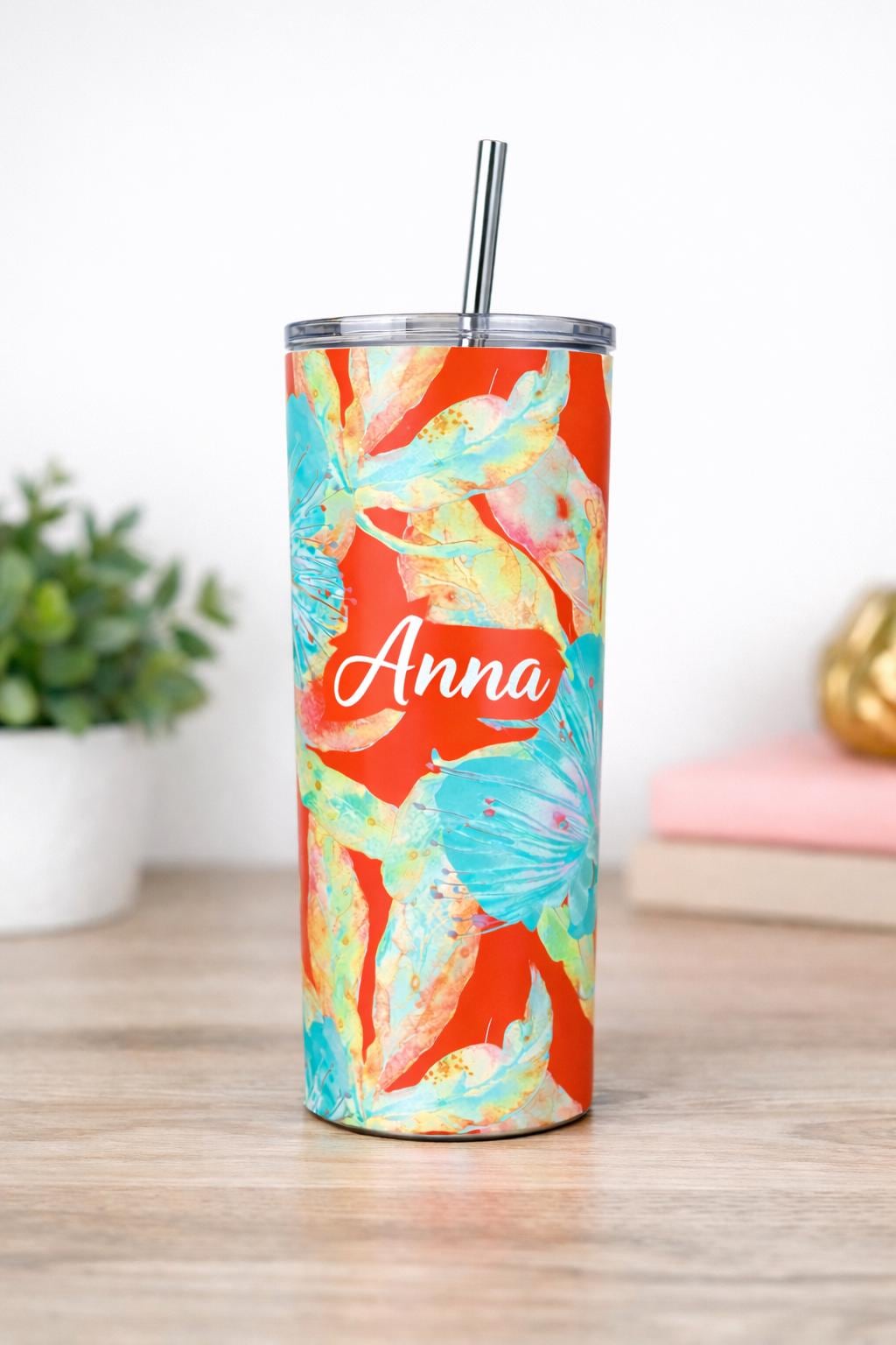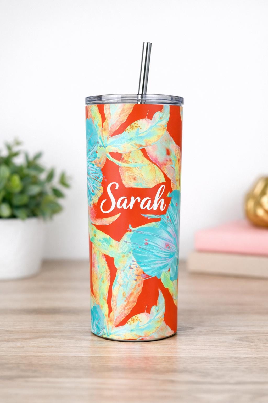 Featuring a vibrant watercolour floral design with turquoise leaves and warm coral tones, this 20oz slim tumbler can be personalised with any name or wording, making it a thoughtful and practical keepsake.