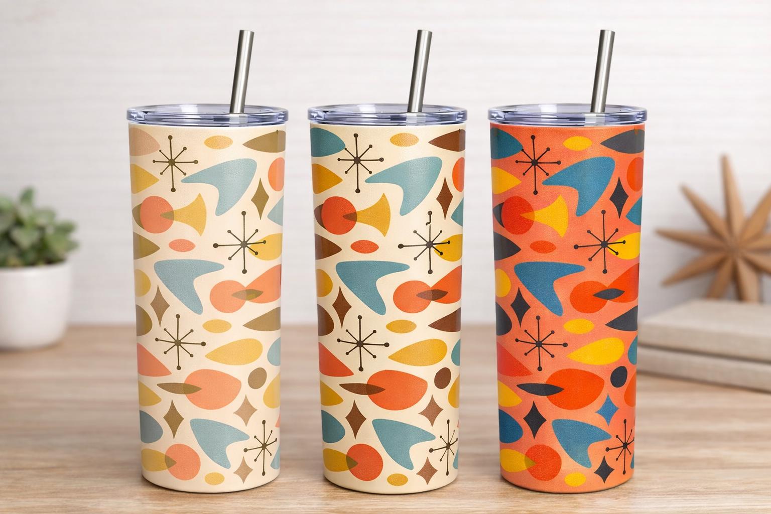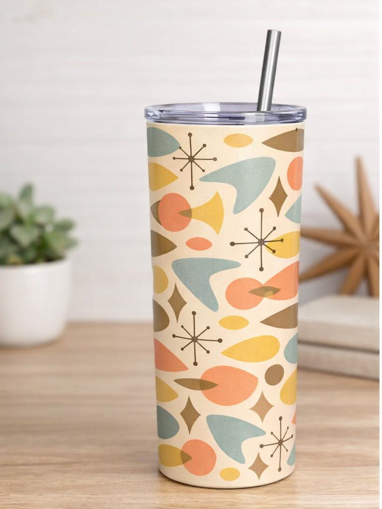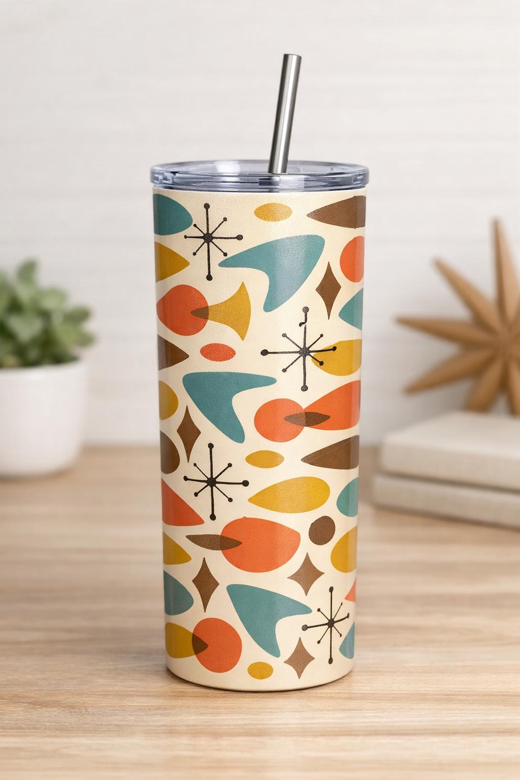 Add a touch of retro style to your daily routine with this personalised mid-century modern tumbler, featuring bold geometric shapes and classic atomic details inspired by 1950s and 1960s design.
