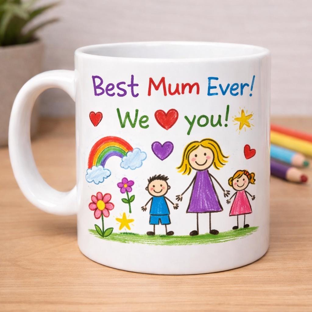 Designed to feel warm, playful, and personal, this mug makes a thoughtful gift from children, partners, or anyone wanting to show appreciation in a fun and meaningful way. The bright crayon-style illustration gives a nostalgic handmade feel while still looking vibrant and professional on a crisp white ceramic mug.