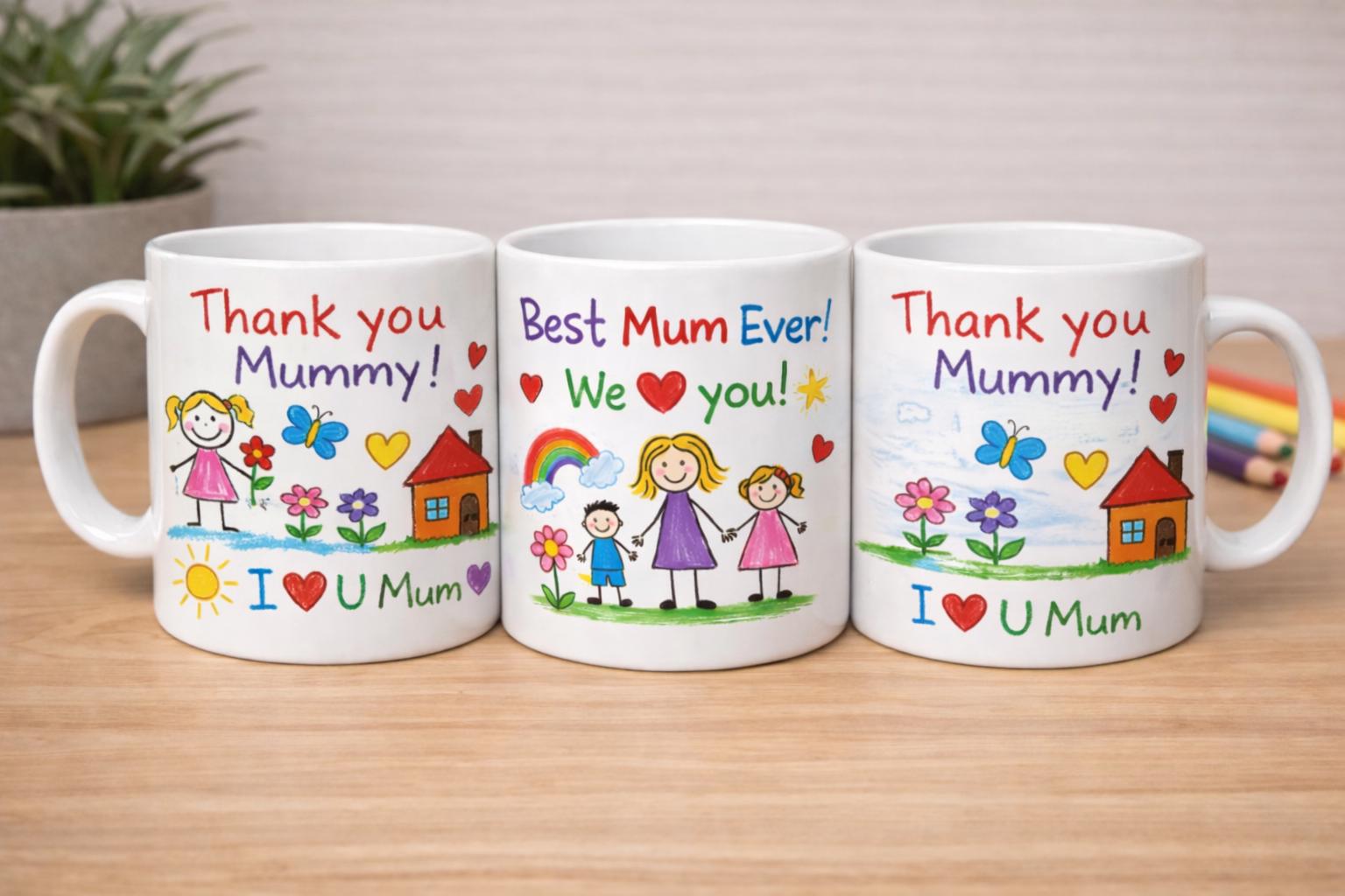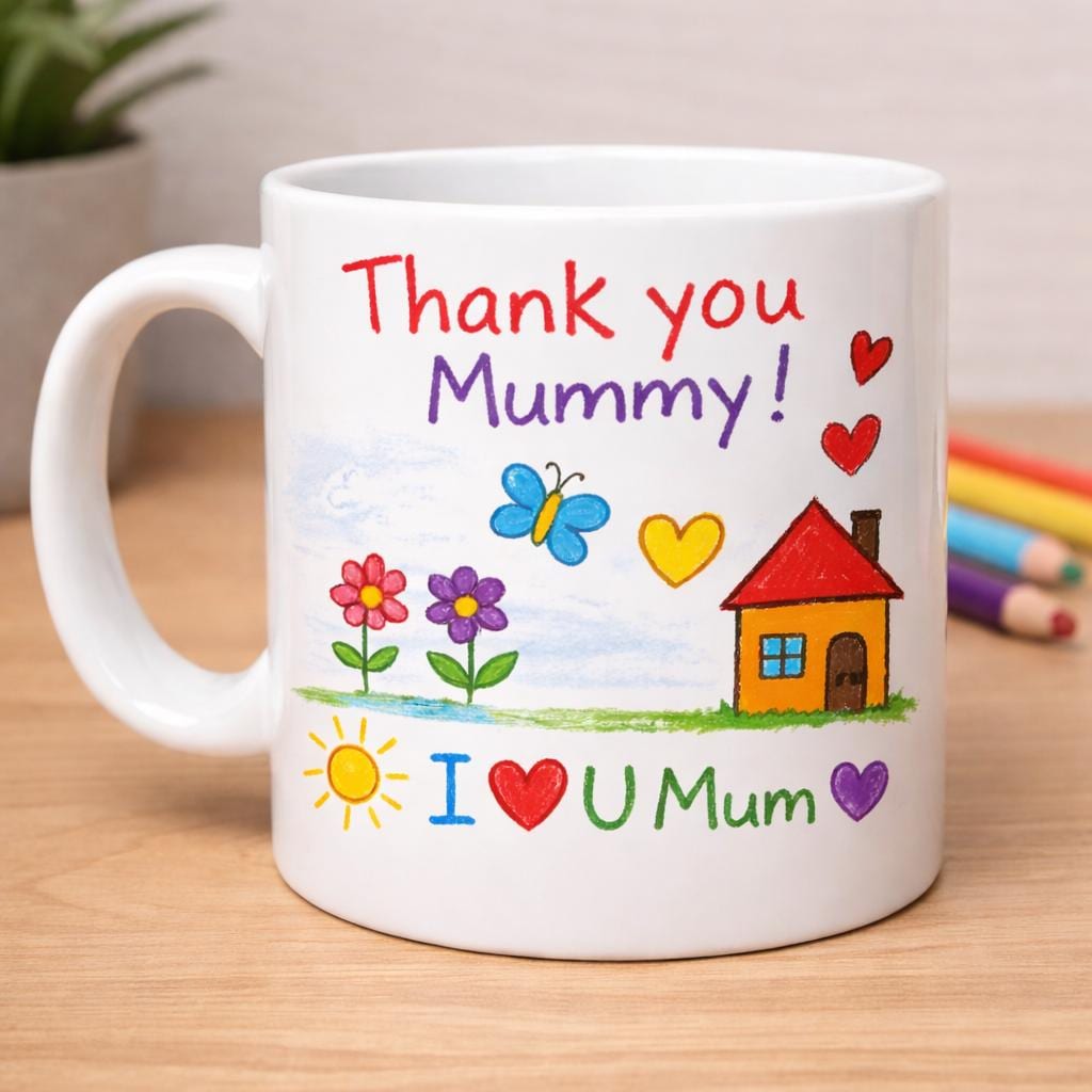 Celebrate Mum with a heartfelt mug that looks just like a child’s hand-drawn masterpiece. This adorable “Thank You Mummy” design features colourful doodle-style artwork including flowers, hearts, sunshine, and a sweet family scene — perfect for Mother’s Day, birthdays, or simply saying “I love you”.