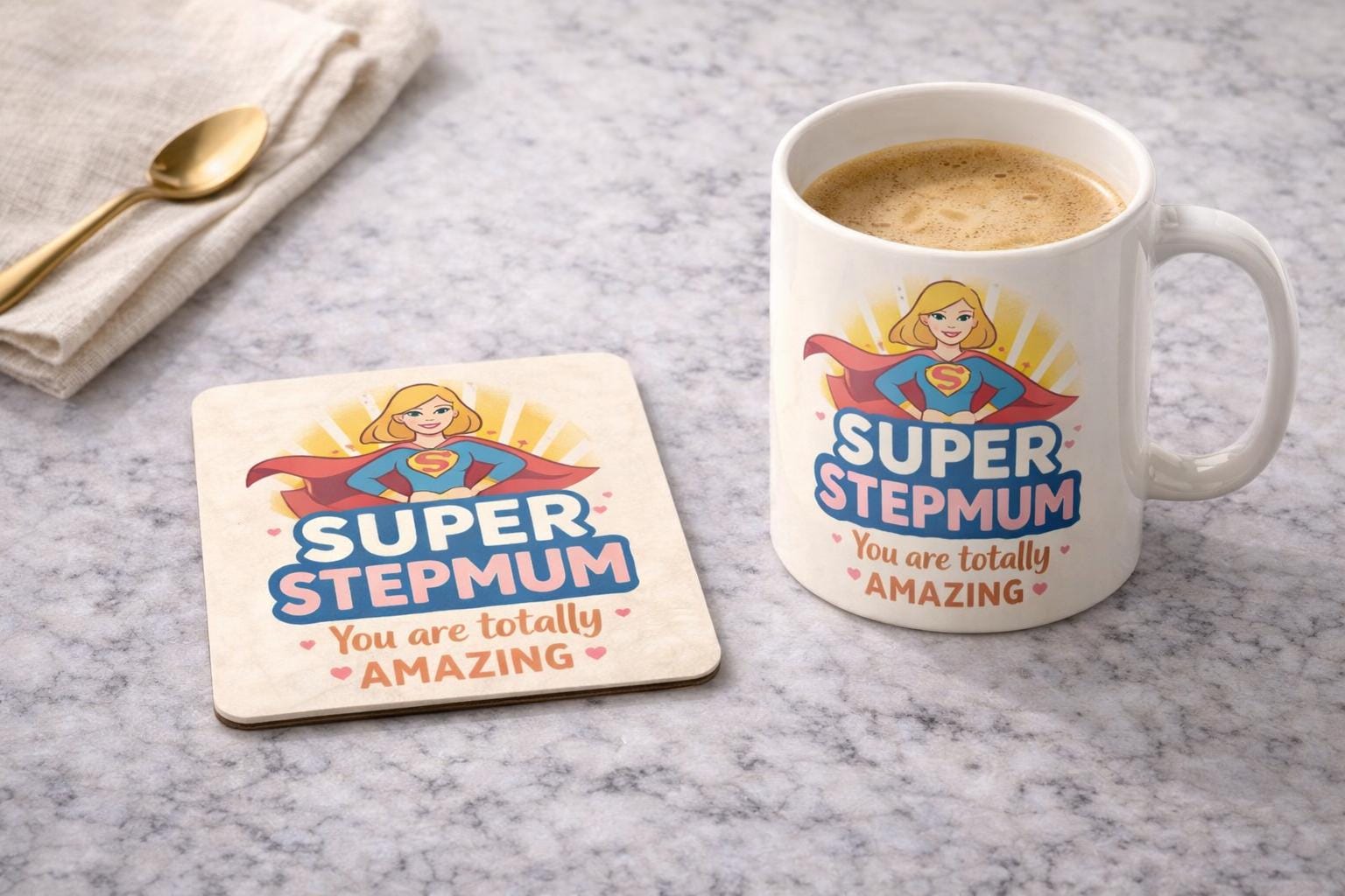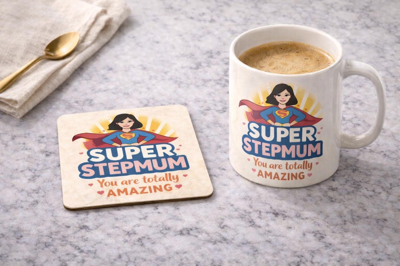 Celebrate an amazing stepmom with this fun and thoughtful Super Stepmom mug and coaster set 💙