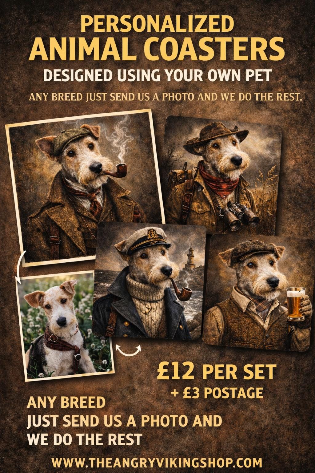 Our Personalised Pet Coasters are custom designed using your own pet’s photo, transformed into stunning vintage-style animal portraits. Whether it’s a dog, cat, or any breed at all, we do the rest.