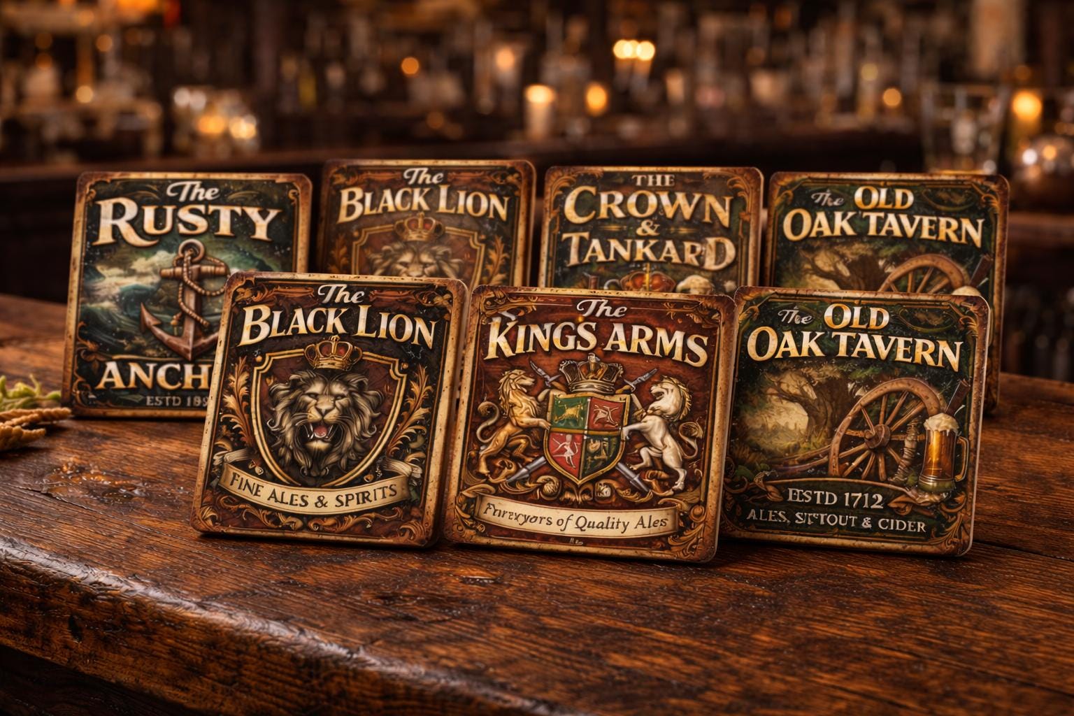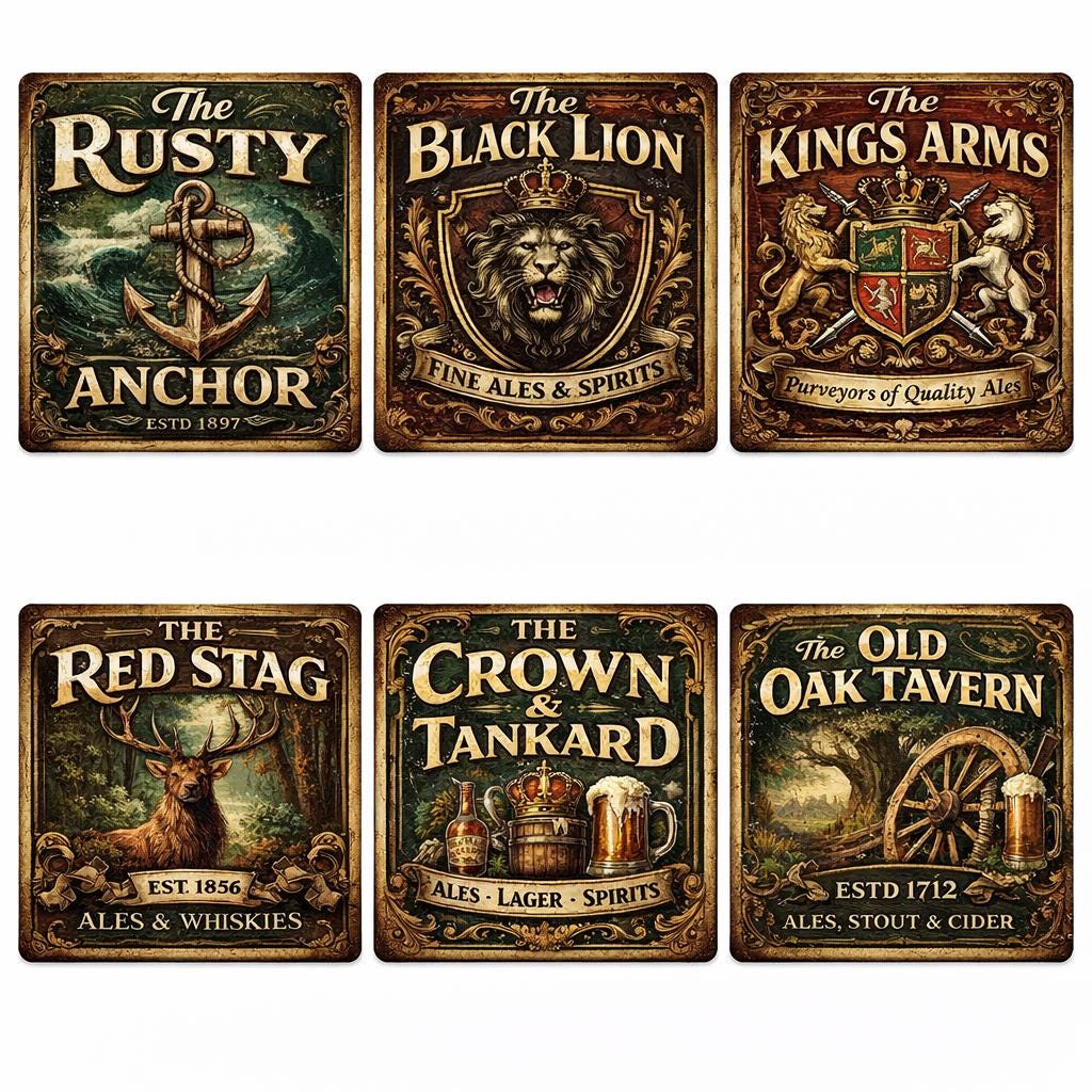 Bring classic British pub charm straight to your home with this vintage-style coaster set inspired by traditional alehouse signs and historic taverns. Featuring richly detailed artwork and timeless pub names like The Rusty Anchor, The Black Lion, The Kings Arms, The Red Stag, The Crown & Tankard, and The Old Oak Tavern, these coasters add character to any table, bar, or man cave.