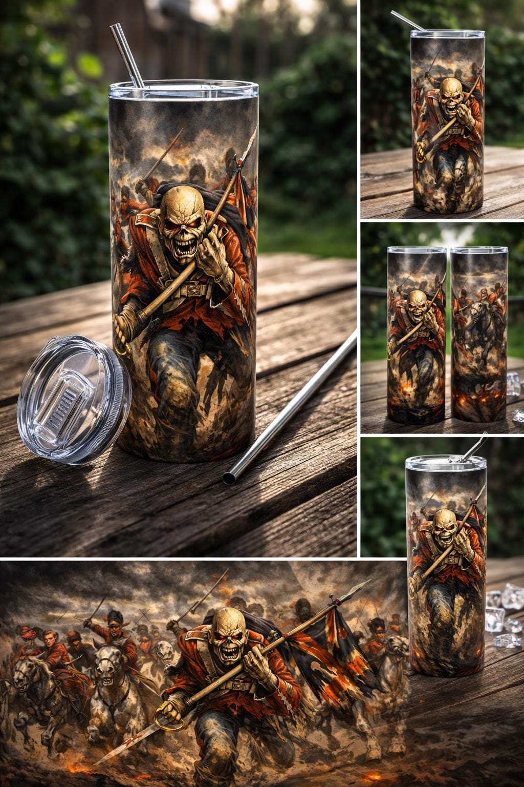 Wrapped in intense, high-detail artwork showing a fearsome skeletal warrior charging through smoke, fire, and chaos, this tumbler is perfect for fans of metal music, gothic art, fantasy battles, and bold alternative style.