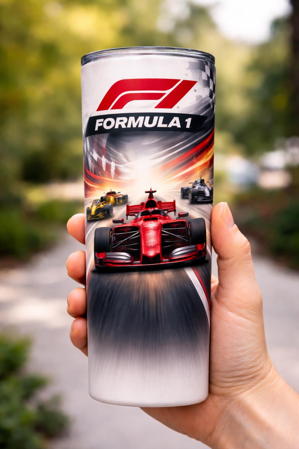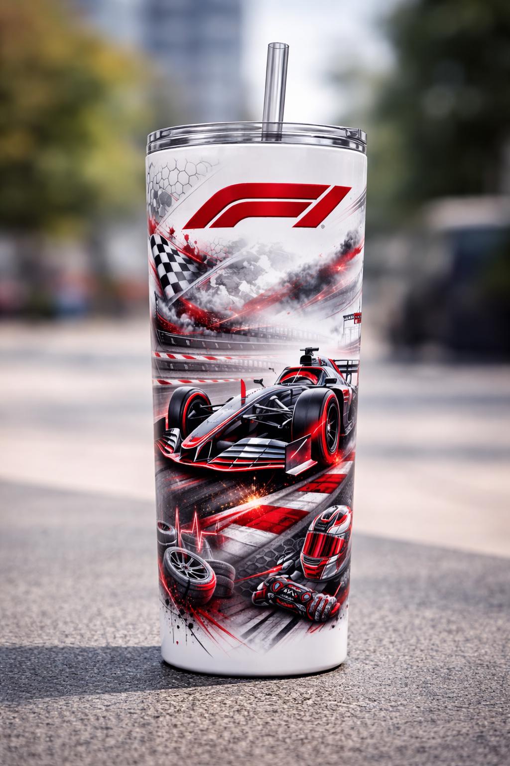 This high-impact 20oz skinny tumbler features a bold Formula-inspired racing design in striking red, black and white. Showcasing a dynamic single-seater race car, chequered flag detail, racing helmet and track elements, this wrap delivers serious motorsport energy. The sharp lines, glowing red accents and dramatic track scene make it a must-have for any racing enthusiast.