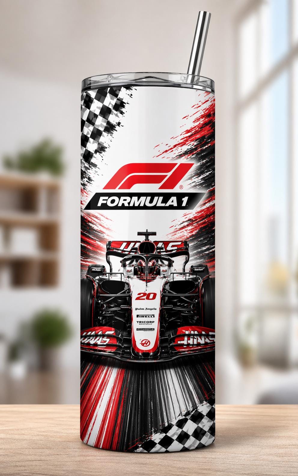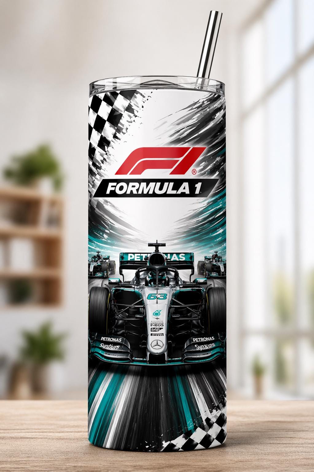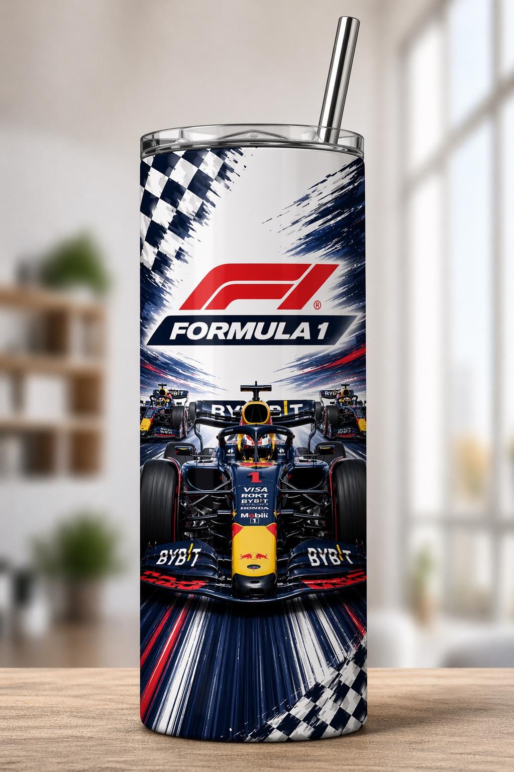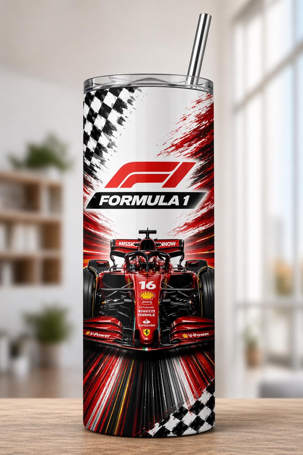 This high-impact 20oz skinny tumbler features a bold Formula-inspired racing design in striking red, black and white. Showcasing a dynamic single-seater race car, chequered flag detail, racing helmet and track elements, this wrap delivers serious motorsport energy. The sharp lines, glowing red accents and dramatic track scene make it a must-have for any racing enthusiast.