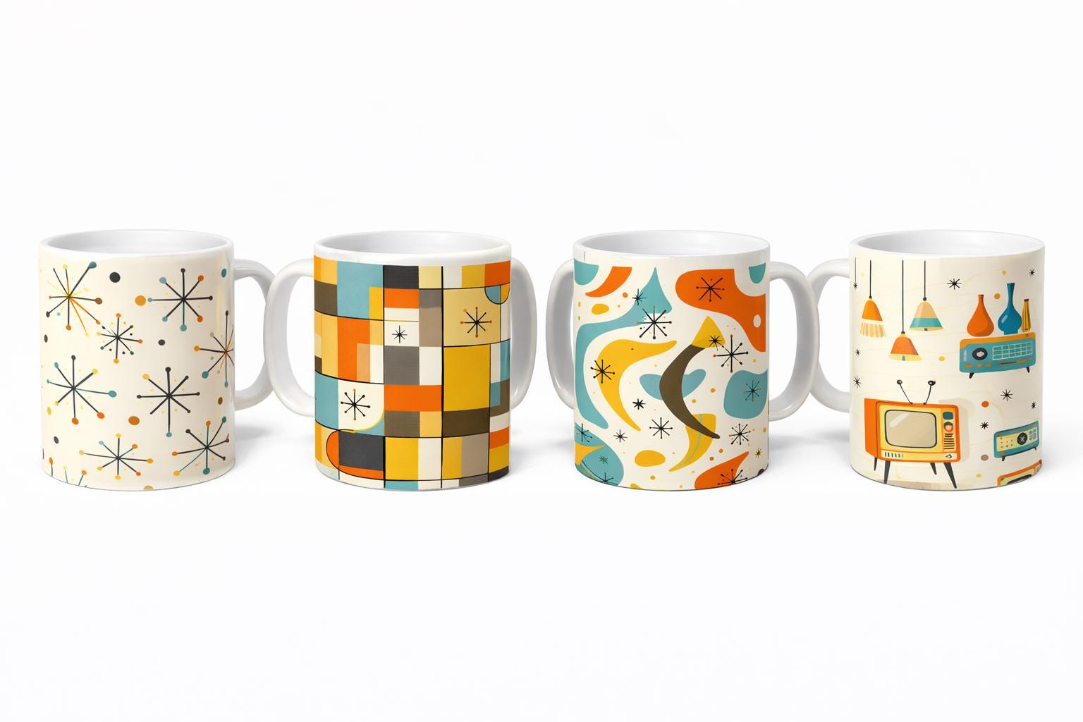 This Mid Century Modern mug collection features four bold retro-inspired designs, each celebrating classic 1950s and 1960s atomic-era style. From iconic starburst patterns to geometric block layouts, abstract pebble forms and vintage living room motifs, this set captures the playful optimism of mid century interiors.