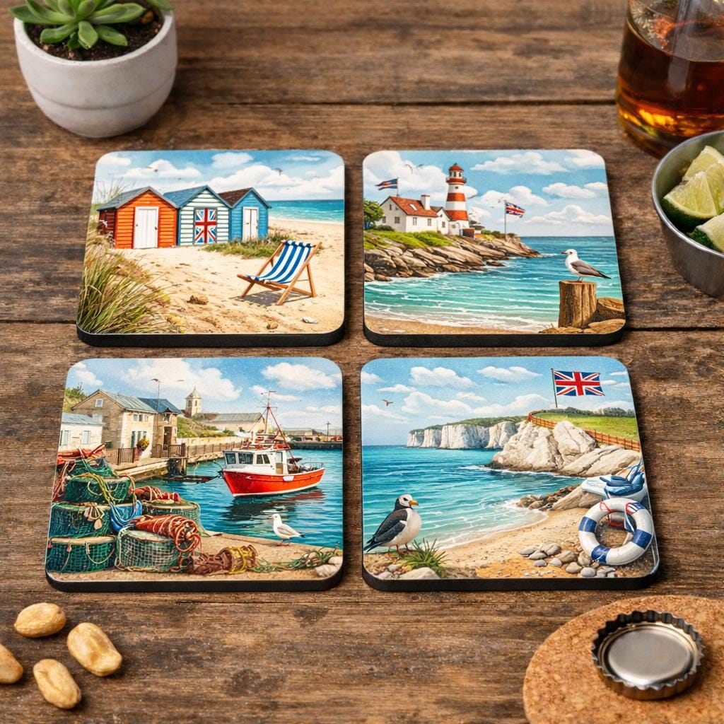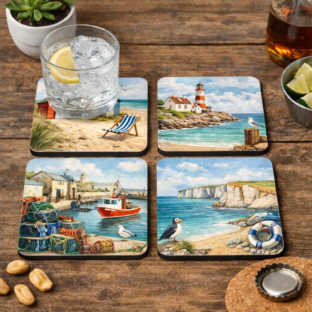 Bring the charm of the British seaside to your home with this beautiful set of four coastal themed drink coasters. Inspired by classic UK coastal scenes, each coaster features a detailed illustration capturing the relaxed atmosphere of seaside life.
