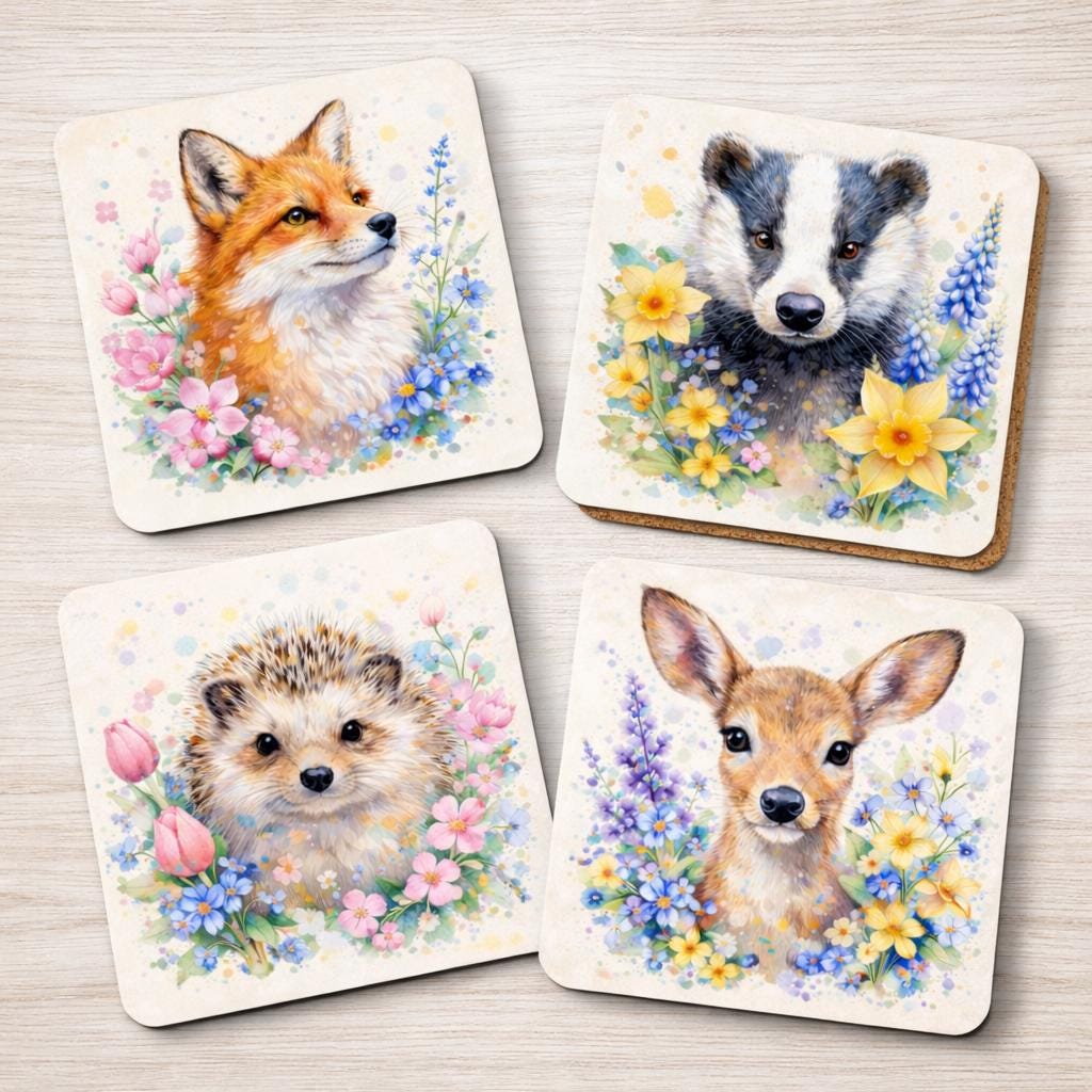 Each coaster showcases a detailed portrait surrounded by soft meadow flowers and gentle paint splashes, creating a light and natural cottagecore aesthetic. The set includes a fox, badger, hedgehog and deer, making it perfect for nature lovers and wildlife enthusiasts.