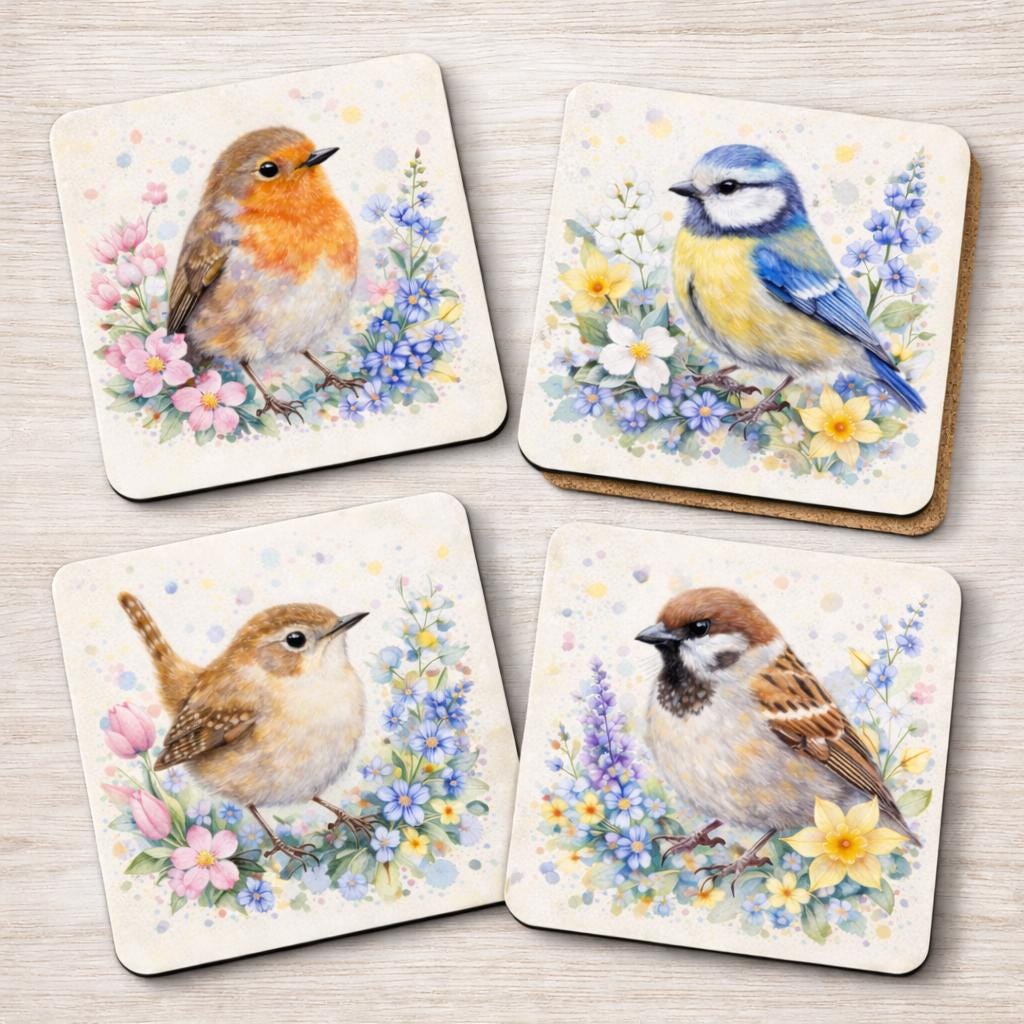 Each coaster showcases a delicate hand painted style illustration surrounded by soft spring flowers and wild meadow colours. The set includes a Robin, Blue Tit, Wren and Sparrow, creating a charming woodland and cottage garden aesthetic that suits both modern and rustic homes.