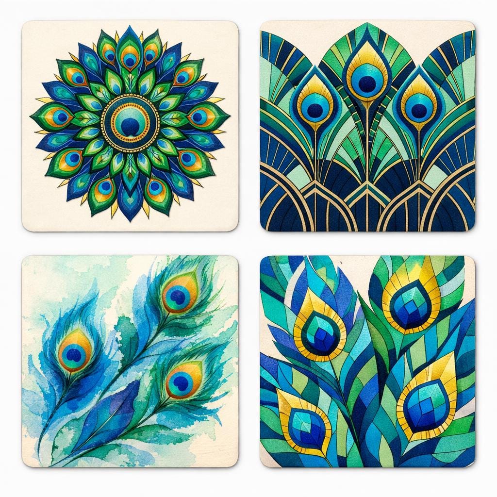 Bring colour and elegance to your table with this beautiful Peacock Feather Coaster Set. Inspired by the rich colours and intricate patterns of peacock plumage, each coaster features a unique design combining boho mandala, art deco geometry, and soft watercolour feather illustrations.