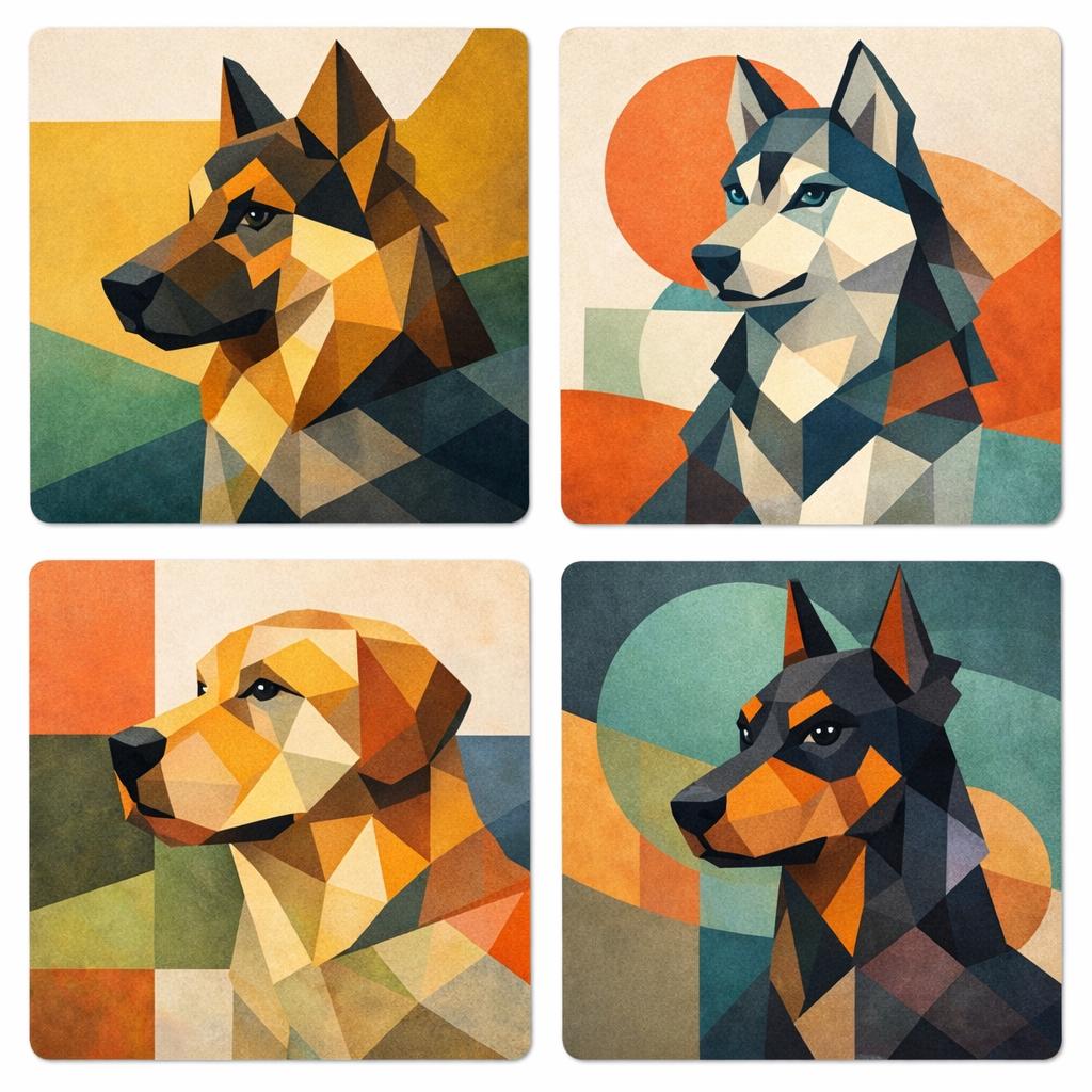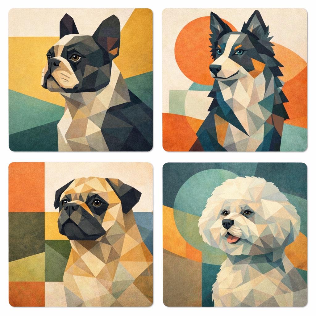 Add a stylish modern touch to your coffee table with this geometric dog breed coaster featuring a striking low poly portrait design. Inspired by contemporary polygon artwork, each coaster showcases a beautifully illustrated dog in bold geometric shapes and warm retro tones.
