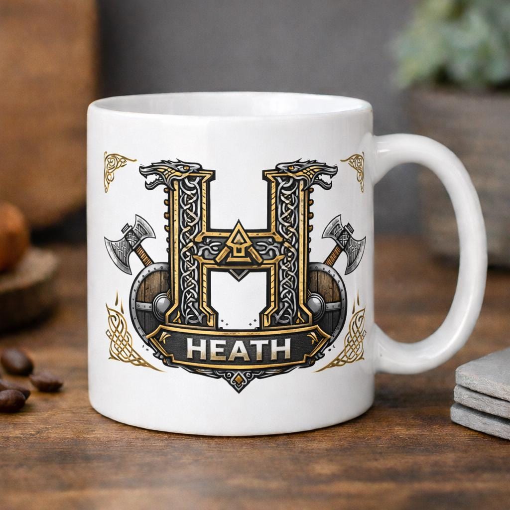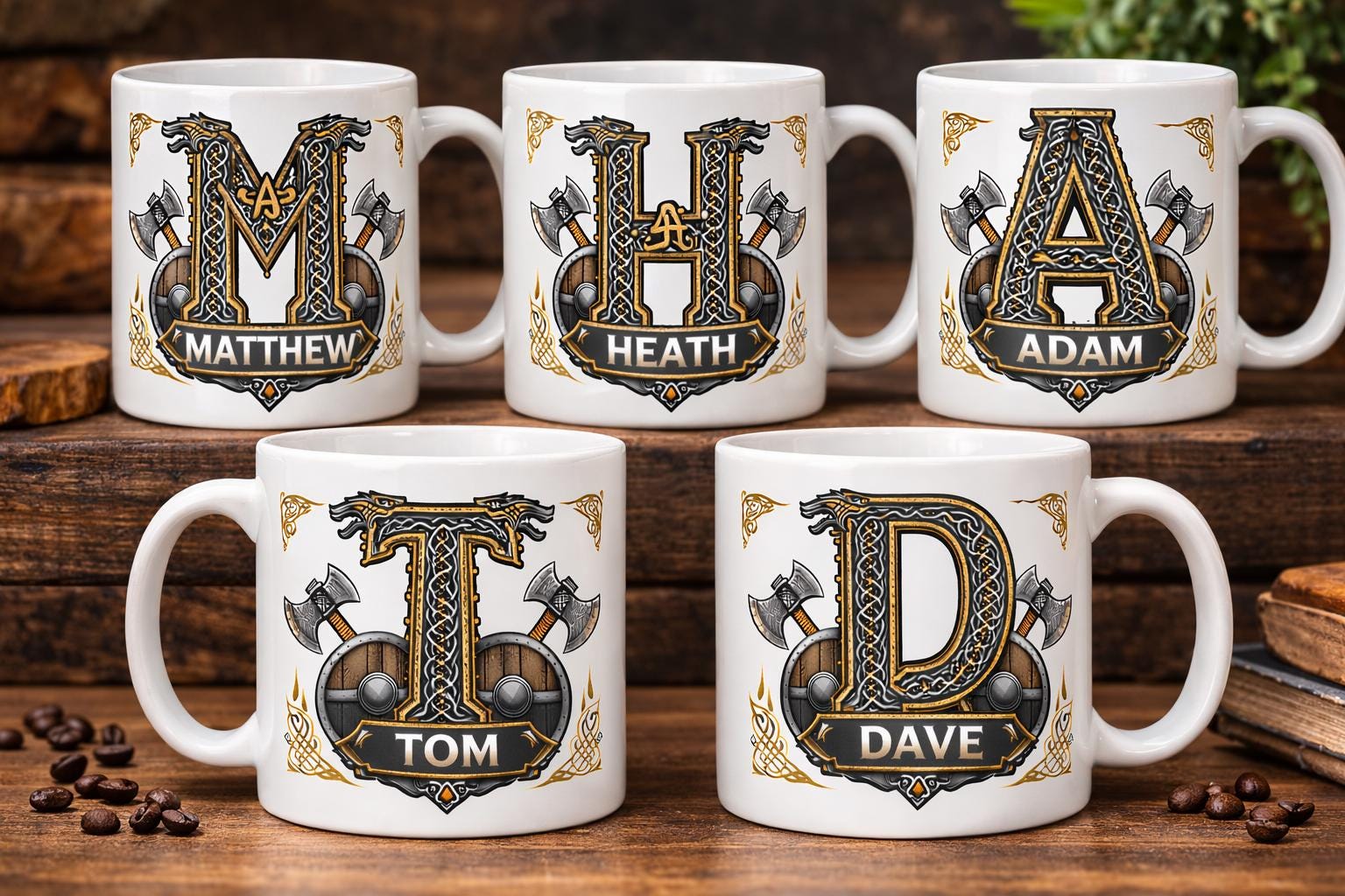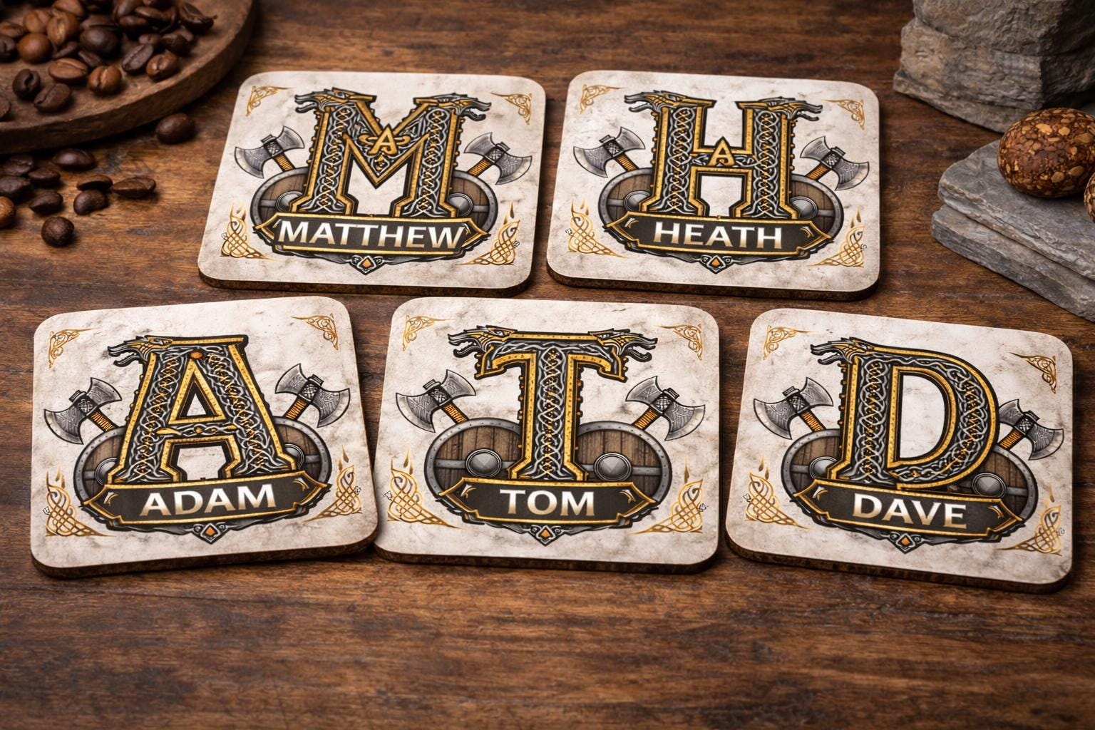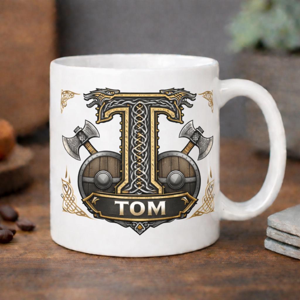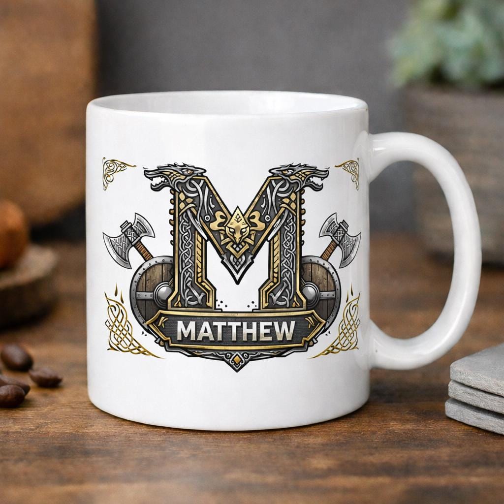 Each design features a bold Viking inspired initial surrounded by intricate Celtic knotwork, shields and crossed battle axes, creating a powerful Nordic aesthetic that stands out beautifully on both the mug and coaster.