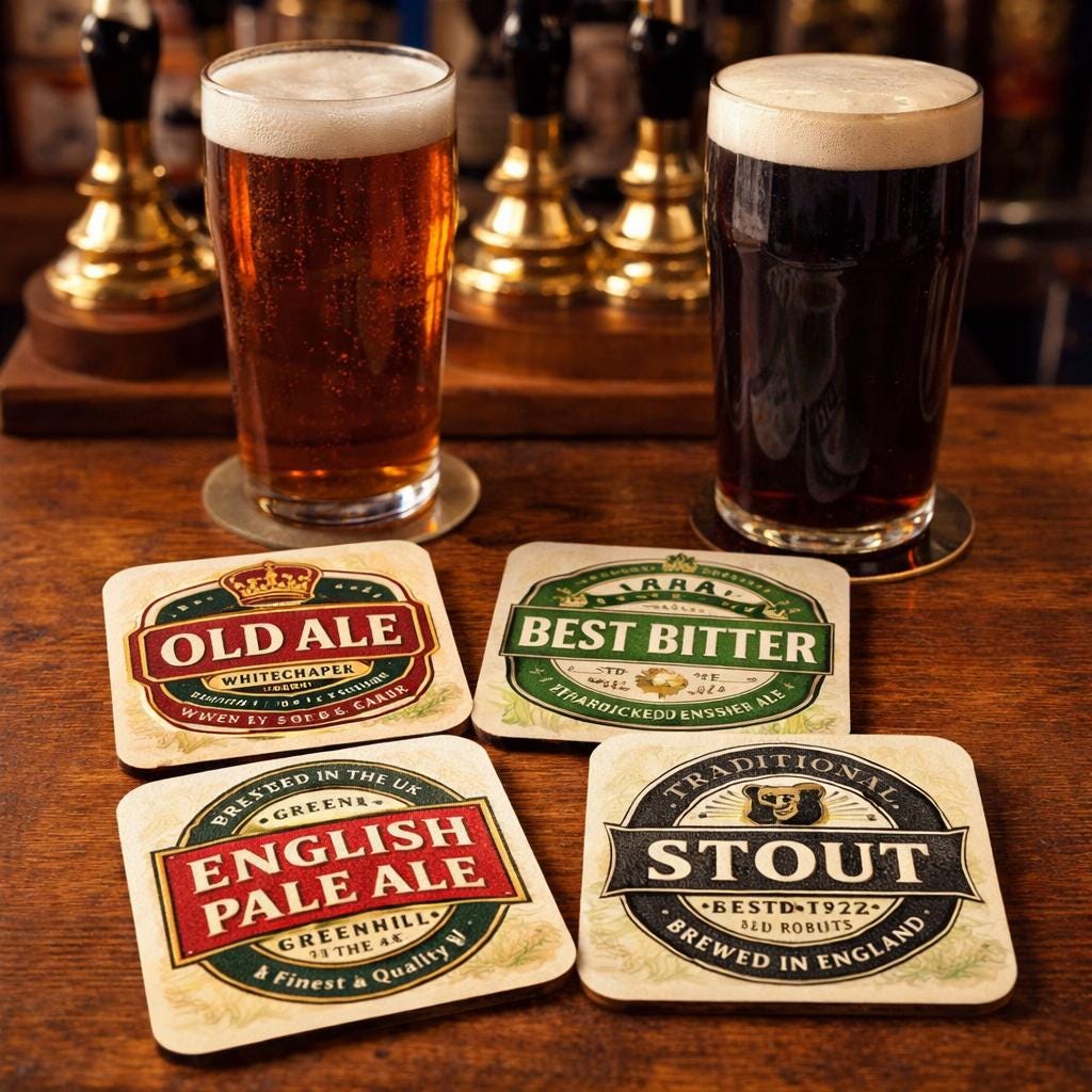 Each coaster features a bold retro brewery label style illustration including Old Ale, Best Bitter, English Pale Ale and Traditional Stout, capturing the authentic charm of hand pulled ales found in pubs across Britain.