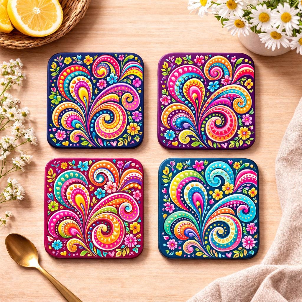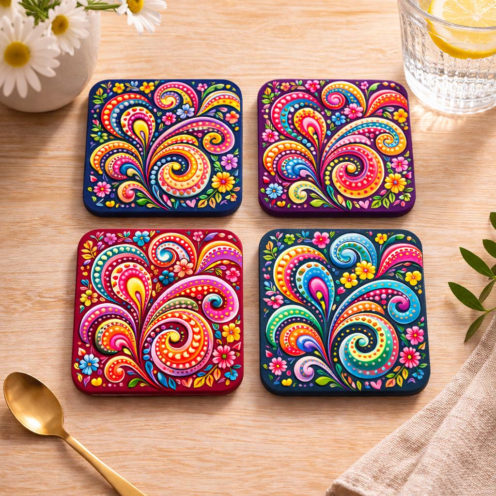 Bring colour and personality to your table with this vibrant set of four paisley coasters. Each coaster features a striking swirling floral design inspired by boho and folk art patterns, filled with bold colours and intricate details that instantly brighten any room.