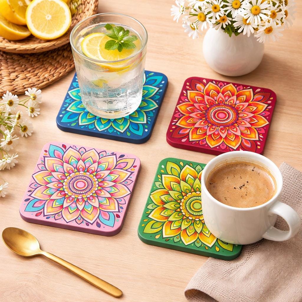 Add a splash of colour to your home with this vibrant set of mandala coasters. Each coaster features a beautifully detailed floral mandala design with bold colours and intricate patterns that instantly brighten any table setting.
