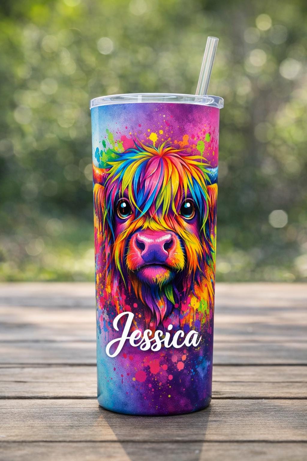 Featuring a stunning psychedelic Highland cow in bright neon colours, this tumbler is customised with your chosen name for a truly one of a kind piece. Whether you are buying for yourself or gifting to someone special, this design is guaranteed to stand out.