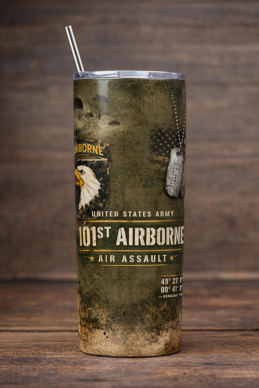 Honor the legacy of the 101st Airborne Division with this bold, military-inspired skinny tumbler. Designed with a rugged, distressed finish, this piece captures the spirit of the legendary Screaming Eagles and the proud tradition of the United States Army Air Assault.
