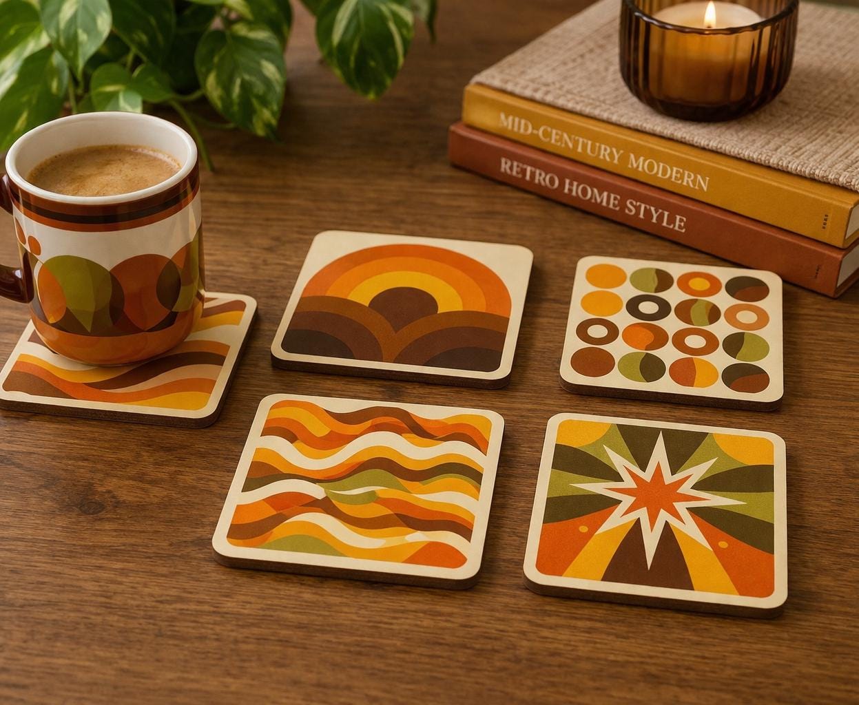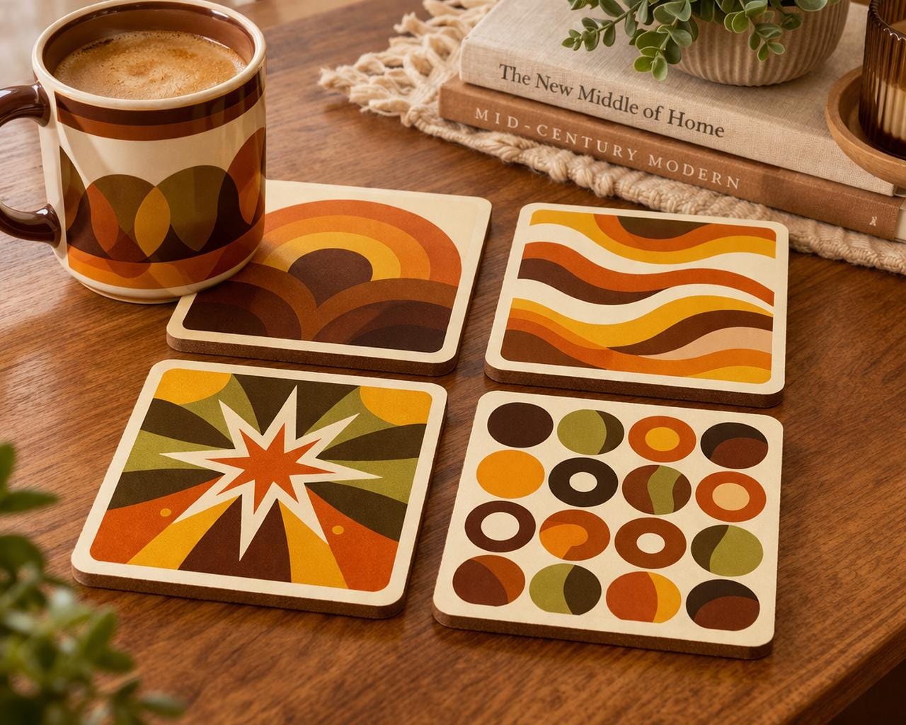 Bring bold retro energy into your home with this striking set of four mid century modern coasters, inspired by iconic 1970s design.