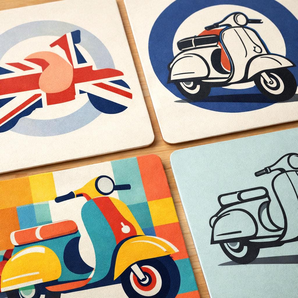 Bring a touch of retro charm to your home with this stylish set of scooter-themed coasters, inspired by classic British mod culture and vintage Vespa design.