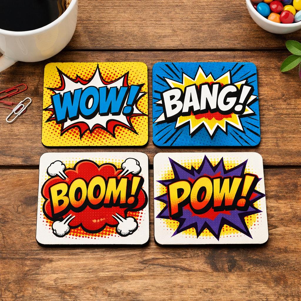 Add a bold pop of colour and personality to your home with this vibrant set of retro comic style coasters. Inspired by classic 1960s pop art, each design features iconic comic book exclamations including WOW, BANG, BOOM and POW, brought to life with striking halftone patterns and dynamic burst effects.