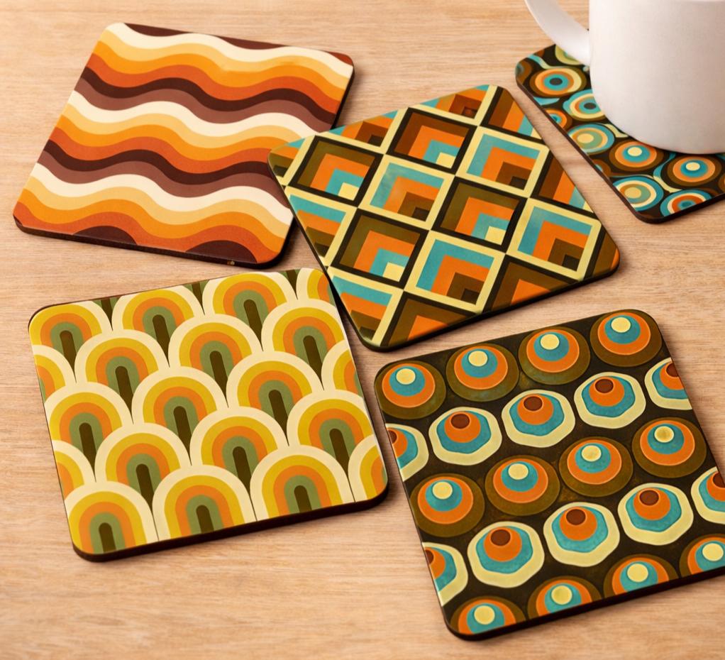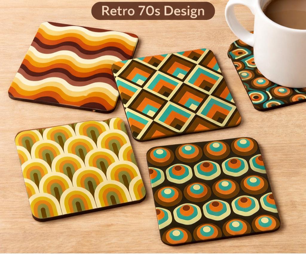 Each coaster showcases a distinct vintage style including flowing sunset waves, retro arches, geometric tiles and classic circular motifs. Designed to capture the essence of 1970s interiors, they are perfect for adding personality to your home or gifting to lovers of retro decor.
