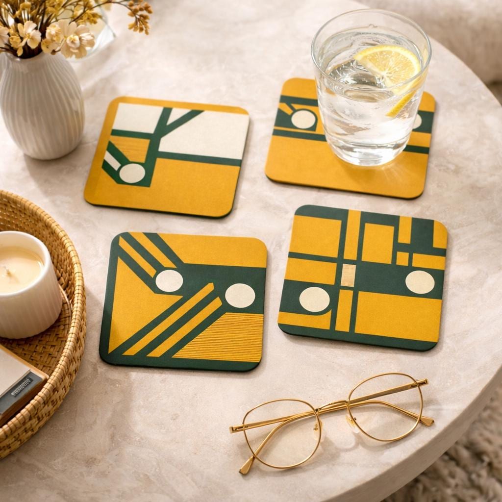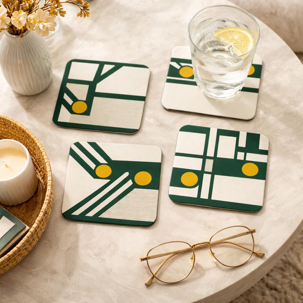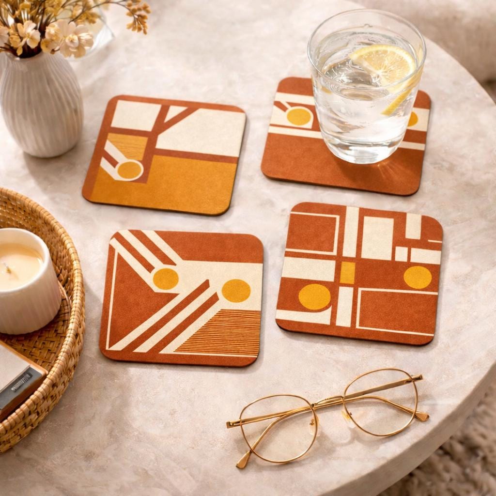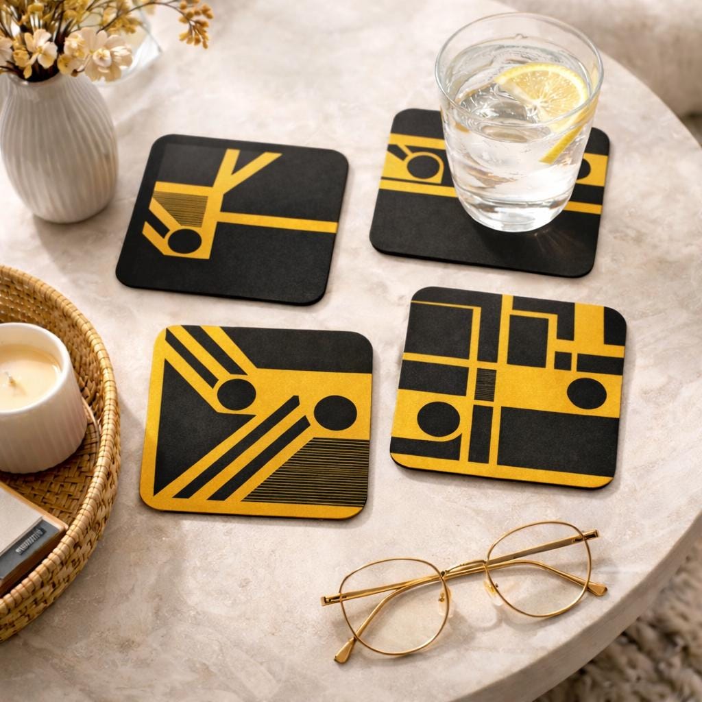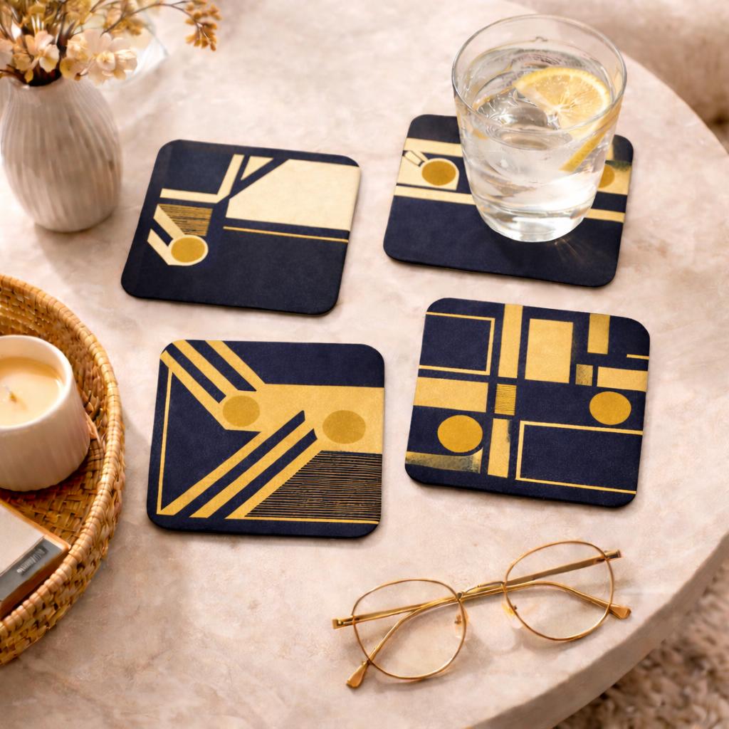 Each coaster features a unique yet perfectly coordinated abstract pattern, combining deep navy tones with warm gold accents and clean architectural lines. Designed to feel both contemporary and timeless, this set adds a premium look to coffee tables, desks, and dining spaces.