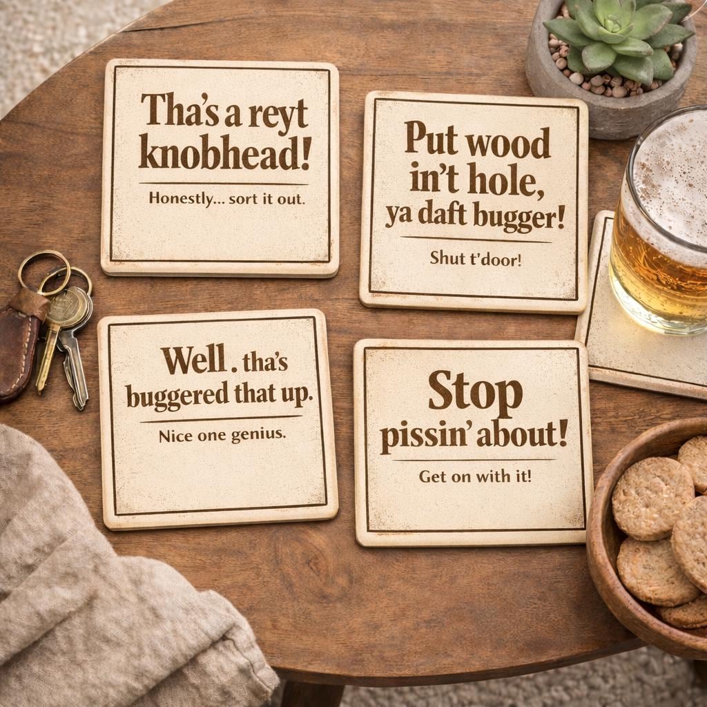 Bring a bit of proper Yorkshire attitude into your home with this set of 4 cheeky Yorkshire slang coasters — perfect for anyone who enjoys a laugh, a brew, and a bit of northern honesty.