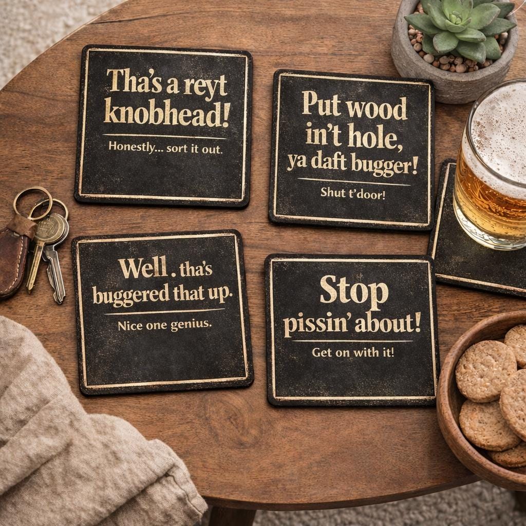 Featuring phrases like “Tha’s a reyt knobhead!” and “Stop pissin’ about!”, these coasters are guaranteed to get a reaction.